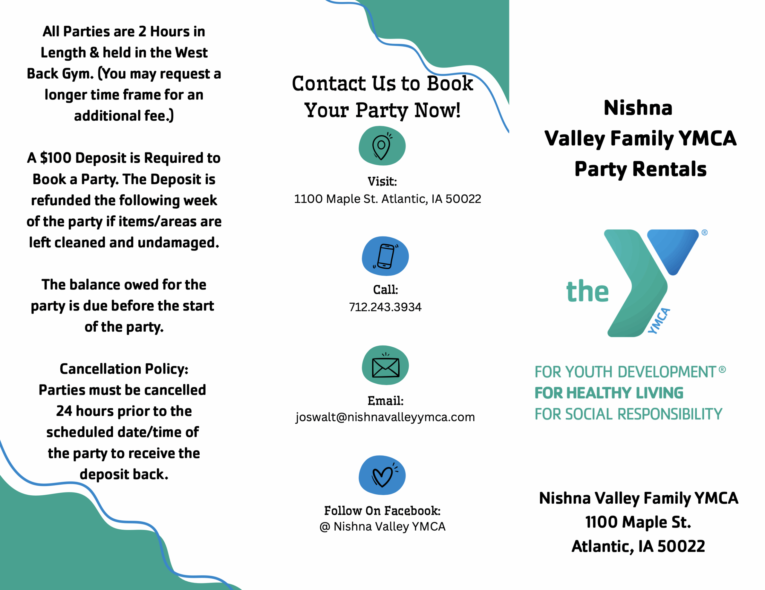 To inquire about availability, pricing, and to book a facility rental, please contact our friendly staff. We are dedicated to providing a positive and enjoyable experience for all of our guests. Let us help you create memorable moments and make your next event a resounding success at Nishna Valley YMCA.